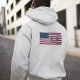 Stay warm while showcasing your national pride with this custom hoodie featuring a bold USA soccer design on the back. This high-quality hooded sweatshirt is perfect for cool game days or casual everyday wear, offering a comfortable fit for dedicated fans. The back features a vibrant stars and stripes background, personalized with your custom name and jersey number. A crisp white outline ensures the text is perfectly readable against the red and white stripes. Complete with a dynamic soccer player silhouette and "USA!" typography, it is a spirited and functional way to represent your team.