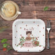 "Set the table with sweetness using these adorable personalized paper plates, designed specifically for Samantha's 'Berry Sweet' Baby Shower! Each square plate features a delightful illustration of a charming little girl holding a basket of strawberries, accompanied by our whimsical snail carrying a strawberry house, and lush strawberry vines.