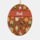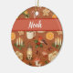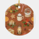 This personalized ceramic Christmas ornament brings warm, cozy vibes to your holiday tree with hand-drawn gingerbread cookies, oranges, candles, a winter bird, gifts, and a vintage lantern on a soft brown background. Add any name or short text in the editable banner to create a unique keepsake for kids, families, friends, teachers, or coworkers, perfect as a stocking stuffer, Secret Santa gift, or yearly family tradition. Simply click “Personalize” to change the name, font, and text color so your ornament matches your holiday style.