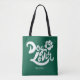 This cute tote bag is perfect for any dog lover. Carry around stuff for your dog or for yourself. It works either way and comes in different sizes to fit your needs. The text that appears in white on the front and back is hand-lettered and reads, "Dog Lover," set against a hunter green background. There is also a hand-drawn paw print with a cut-out heart in the middle. The text is modern yet has a vintage vibe. On the front (bottom-center) is a spot for you to personalize or write your own custom text such as "Best Dog Mom" or "Luna's Mom." No matter if you keep it for yourself or gift it, this fun tote is sure to bring a smile to anyone any time they see it.