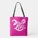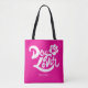 This cute tote bag is perfect for any dog lover. Carry around stuff for your dog or for yourself. It works either way and comes in different sizes to fit your needs. The text that appears in white on the front and back is hand-lettered and reads, "Dog Lover," set against a hot pink background. There is also a hand-drawn paw print with a cut-out heart in the middle. The text is modern yet has a vintage vibe. On the front (bottom-center) is a spot for you to personalize or write your own custom text such as "Best Dog Mom" or "Luna's Mom." No matter if you keep it for yourself or gift it, this fun tote is sure to bring a smile to anyone any time they see it.