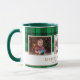Personalized Family 3 Photo Collage Green Tartan Plaid Pattern Christmas Mug. Merry Christmas and a custom text. Add three photos. Personalize the text any way you wish or delete it. The background features a green plaid pattern. Great as a Christmas gift or a keepsake mug for the family.