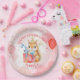 Girl's birthday party personalized paper plates with a cute watercolor squirrel wearing a birthday hat and a holding a gift illustration. The background is pink and red with a watercolor texture. You can add your daughter's name and age in the personalize area.