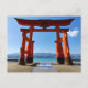 Celebrate one of Japan’s most iconic landmarks with this stunning Miyajima postcard. The floating torii gate of Itsukushima Shrine rises from calm waters in vivid vermilion, framed by distant mountains and a peaceful cityscape beneath a clear blue sky. This image captures the sacred elegance and architectural wonder of a site revered for centuries.