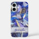 Personalized customized with calligraphy handwritten script name iPhone case. Unique design, digital version inspired from my abstract artwork with pieces of ribbon and thread. Nuances of blue, navy, cyan, teal, turquoise, aqua, white, gray, lilac, purple, lavender in a trendy maximalist composition. The intricate striped motif could suggest also the nautical marine maritime theme. Fashionable accessory to protect your cellphone or a great creative thoughtful useful gift idea for her. Suitable for many occasions and celebrations, like birthday, Mother’s Day, graduation, Christmas present etc. A very affordable and attractive gift under 40 dollars for her.