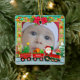 The square ornament is trimmed with a bright, cheerful border of snowflakes, holiday lights, and poinsettias, making it a beautiful addition to any holiday tree.
