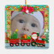 Capture a treasured moment with this adorable photo Christmas ornament! Featuring a charming North Pole Express train carrying Santa, gifts, and a festive Christmas tree, this design provides a perfect, colorful frame for your favorite baby, child, or family photo.