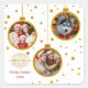 The design features: Three customizable photo frames styled as hanging Christmas ornaments (gold circles).