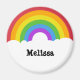 Brighten up your refrigerator with this round magnet that's ready to be personalized with a name or other text. This circle shaped magnet has a retro style rainbow and clouds illustration in bold, bright colors. Your name appears in black lettering in the white clouds.