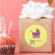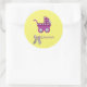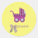 Handgeschnittener, dunkelrosafarbener Roller mit dunkelrosa Band mit Blume, geklebter weißer Knöpfe auf den Rädern, schöner weißer und hellrosa Bogen und schöner gelber Hintergrund für Babydusche auf klassischem Rundaufkleber, Glossy. *Alle Dinge, die Sie auf den Produkten sehen, sind handgefertigt, aber Sie müssen wissen, dass Sie ein Foto bekommen!
