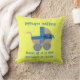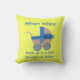 Handgeschnittene Pfirsichkutsche mit blauem Bogen und blauem Band und geklebten blauen Knöpfen auf den Rädern und hellgelbem Hintergrund auf dem Kissen für Babydusche. *Alle Dinge, die Sie auf den Produkten sehen, sind handgefertigt, aber Sie müssen wissen, dass Sie ein Foto bekommen!