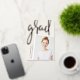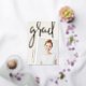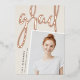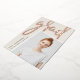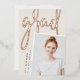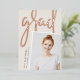 Ein modernes Foto-Abschluss-Foto mit einer leichten Neigung für einen frischen Look ist mit einem vertikalen oder porträtorientierten ausgestattet. "Grad" erscheint in der Rose mit einem Pinsel, goldenen Blattgold, Schrift Typografie. Personalisieren Sie mit dem Namen, der Schule und dem Abschluss Jahr. Fügen Sie der Rückseite eine persönliche Nachricht und ein zusätzliches Foto hinzu.