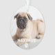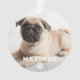 Ein individuelles Haustier-Ornament für Hundeliebhaber bietet ein Foto eines Furry-Freundes auf der Vorderseite mit einem einfachen und modernen Vornamen-Monogramm mit Pfotendruckakzent in Weiß. Die Rückseite des Ornaments wird durch ein koordinierendes Druckmuster bedeckt. Die weiche schwarze Hintergrundfarbe auf der Rückseite kann individuell an Ihre Foto- oder Weihnachtsdekoration angepasst werden.