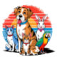 A vibrant animated scene featuring a cheerful dog at the forefront, surrounded by a playful cat, a curious rabbit, a lively parrot, and a sweet guinea pig. The background transitions from warm sunset hues to cool stripes, creating a lively atmosphere. The camera performs a gentle zoom out, revealing the full ensemble while highlighting their playful interactions. The lighting is bright and inviting, enhancing the joyful mood of this colorful pet gathering.