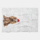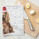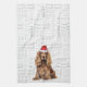Here's a fun holiday kitchen towel or year-around hand towel. An adorable watercolor illustration of a Cocker Spaniel dog who sits with a fun 'woof' word art background. The dog wears a Santa hat.