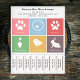 Ein Flyer mit Tear Off Strips für alle Haustierdienste wie Tierarzt, Hundewanderer, Katzensitzer, fütternd Kaninchen, Fischpflege, Vogelpflege, Pflanze-Tränken, Haustier-Boarding, etc. Es wird mit farbigen Quadraten und Bildern von Katzenpfoten, Hundepfoten, Fischschüssel, Pflanze, Vögel und Kaninchen geliefert - man kann sie mit eigenen Fotos, Logos oder Bildern ändern