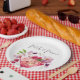 Elegante Gartenfarben mit Champagner-Glass, Berries und Text "Petals and Prosecco" Blumenmotive Brautparty Teller in lila, lavender, rot rosa, pfirsichfarben, apricot und grün.
