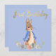 Peter das Kaninchen auf einem blauen Hintergrund mit Gold "First Geburtstag" Text.