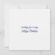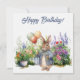 Peter das Kaninchen in seiner blauen Jacke mit farbigen Ballons in seinem Blumengarten mit einem weißen Heftzaun wünscht Ihnen einen sehr glücklichen Geburtstag Gruß auf die Rückseite