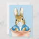 Peter der Kaninchen sitzt in einem Topf, der ein blaues Kaugummi bläst
