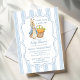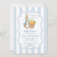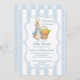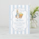 Peter Kaninchen mit einer blauen Jacke und Gartengemüse Babydusche Vorlage Einladung digitalen Sofortdownload. Ein niedlicher Hase in einer blauen Jacke stehend im Veggie-Garten für einen Baby Duschkopf pastellblau Vintag Strip Hintergrund