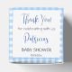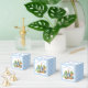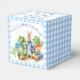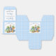 Peter Kaninchen mit blauer Jacke und Gartengemüse Babydusche favorisiert personalisierte Gefälligkeitsschachtel. Ein niedlicher Hase in einer blauen Jacke stehend im Veggie-Garten für ein Baby Dusche pastellblau Gingham Gingham Gefälligkeitsboxen geeignet für Süßmandelnussfavors, kann ca. 20 beschichtete Mandeln