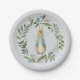 Peter Rabbit Paper Tellers Aquarell Peter Rabbit sonnengeblasen in einer blauen Jacke, umgeben von handbemalten Aquarell-Blume, Beeren und Blattwerk. Diese Teller wären für eine Babydusche oder eine Kindergeburtstagsfeier bezaubernd.