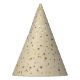 Dieser Partyhut wird in einer beige Farbe mit einem Druck der goldenen petite Sterne des Spaßes ganz über ihm gezeigt.