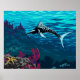 Vista U-Boot de un pez espada rondando en las profundidades. Ilustración digital.
