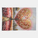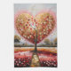 Ein hochsymbolisches und strukturiertes Gemälde mit einem zentralen Baum mit bloßen Ästen, dessen Blätter durch eine Vielzahl kleiner roter, weißer und rosa Herzen ersetzt werden. Der Baum ist gegen ein massives, schimmerndes goldenes Herz positioniert, das den Himmel füllt und einen mächtigen und skurrilen Hintergrund schafft. Der Vordergrund ist eine Landschaft abstrakter, horizontaler Bänder in verschiedenen Rosa- und Rottönen, die an ein kultiviertes Feld erinnern. Ein Pfad mit goldenen Kacheln führt vom Boden der Leinwand bis zum Fuß des Baumes. Der Gesamtstil ist reich an Textur und Symbolik, die Themen der Liebe, der Zuneigung und der Reise ins Herz.