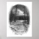 Dieses Poster zeigt eine winterliche Szene in Schwarz-Weiß. Ein langer verschneiten Weg führt aus dem Wald zu einem eisigen, schneebedeckten Teich. Schwarze Baumstämme bilden den Rahmen des Bildes. Ein dramatisch grauer Himmel mit leuchtend weißen Wolken erhellt die entfernte Lichtung.
