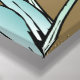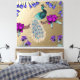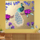 Ein farbenfroher Pfau liegt auf einem Ast mit lebhaften Blume. Der Hintergrund zeichnet sich durch einen goldenen Ton mit texturierten Details aus, der die Eleganz der Szene insgesamt unterstreicht.