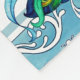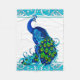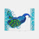 Original gezeichnet von Sandra Gale, mit einem lebendigen und schönen Pfau, umgeben von einem handgezeichneten Rand blauer Wirbel.