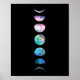 Eine Mondphasen, grafisch dargestellt in hübsch opalinen Farben wie Rosa, Lavendel, Türkis und Blau vor einem schwarzen Hintergrund.