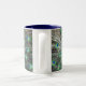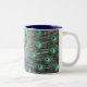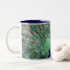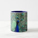 Pfau, der Federn auf einer zwei-getonten Tasse anzeigt