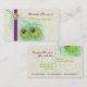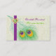 Pfauenfeder mit lila grünem Auge, die Visitenkarten auffängt. Ein elegantes, raffiniertes, stilvolles, stilvolles Design einer Pfauenfeder in Limonem und smaragdgrünen, lila und orangefarbenen Blau, eine lila Band und eine Abbildung eines grünen Herzschmuckdiamanten mit goldener Kontur mit Schichten auf elfenbeinhartem, feuchtem Hintergrund. Modernes, aber klassisches Thema mit einer leichten Touch von Vintag. Beachten Sie, dass das Herz Diamant Juwel ist "bedruckt" und nicht ein echter Kristall, so sind die Stränge. Für den persönlichen oder beruflichen Gebrauch durch Designer, Mode, Accessoires oder Beauty Business.