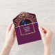 Eine wunderschöne und regale Einladung mit einem regalen und lebendigen Pfau mit seinem strahlenden blauen Brust und seinen luxuriösen Schwanz Federn, die hinter ihm liegen. Er ist von einem königlichen Palastbogen gerahmt, der dekorative Wirbel auf dem ganzen Set vor einem pflaumenfarbenen Hintergrund blüht. Die Hinterklappe begeistert mit verziertem Vintagem Pisley, der das, was kommen soll. Auf beiden Seiten erscheinen die Vorlagen für Ihre benutzerdefinierte Formulierung. Der untere Drittel hat eine Antwortkarte mit personalisierter uAwg-Adresse für Ihre Gäste und eine exquisite Perle und goldverzierte Pfauenfeder. Diese sind ideal für Hindi, Hindu, Sanatani Dharma und ethnisch asiatische Hochzeiten, Verlobungen, Jahrestage, Brautpartys und Geburtstagspartys. Ändern Sie einfach den Wortlaut, um Ihren besonderen Anlass oder Anlass zu Anzug.