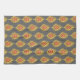 Handtuch in einem Pfauenfedern, textilen Druck, ausgeführt in Adobe Illustrator und Fotoshop - weiche Senfgoldfedern, mit einem Auge in Korallenorange und Gelb, auf einem grau/grauen Hintergrund