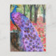 Auf der Suche nach einem exotischen Pfau in dieser Pfauenkunst sitzt ein lila- und saphienblauer Pfau auf einem Holzbaumstumpf in einer herrlichen Wiese voller Korallen und rosa wilder Blume. Pfauenfedern sind Phlox- und Orchideenfarben mit vielen Brauntönen, die die kräftigen Farben ergänzen. Der Hintergrund ist mit braunen Bäumen mit üppigen Zedernholz-Grüntönen und Bambusgelben im Hintergrund gestaltet. Von Miriam Schulman entworfen