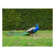 In einem englischen Landgarten steht ein Pfau vor einer Hecke.