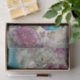Blauer Pfauenvogel auf einem floralen Hintergrund. Touchs von hellen Aquamarinen, dunkelvioletten und magentafarbenen Mustern. Richtig detaillierte illustrierte Landschaft.