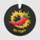 Pfeffer aus rotem Chili mit Flammenkreis. Benutzerdefinierte Hintergrundfarbe. Benutzerdefinierter Text auf beiden Seiten.