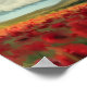 Lebhafte Aquarellwiedergabe aus der originalen Aquarellmalerei. Mohnfeld und Regenbogen mit großer pufffarbiger Regenwolke. Rote, gelbe und orangefarbene Blume verblassen in der Ferne von grünen Hügeln und Bäumen. Der blaue Himmel flüchtige Blick oben durch. Auch auf Leinwand verfügbar.