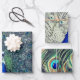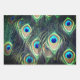 Papierblätter mit 3 verschiedenen Bildern von Pfauen und Pfauenfeder, in kräftigen Farben Blau, Grün und Silber.