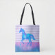 Eine personalisierte Tasche mit einem hübschen Aquarellpferd in Blau und lila Farben. Laufen wild und frei. Set auf lila gestreiftem Hintergrund mit Vintagem Flair. Ein blau-rosa Wasserfarbenrand lag am Boden.