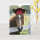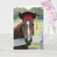Ein Pferd mit roter Abschlussmütze und goldener Quaste steht hinter einem weißen Holzzaun vor dem Hintergrund einer grünen Weide.