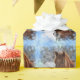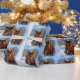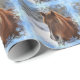 Ein Foto eines Kastanienpferds stehend im Schnee, der durch eine Grenze der blauen Schneeflocken blickt.