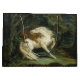 Dieses Design zeigt ein Gemälde des französischen Künstlers Théodore Géricault (1791-1824), der einer der Pioniere der Romantik-Bewegung war. Es zeigt ein Pferd, das von einem Löwen in einer bewaldeten Landschaft angegriffen wird. Das Pferd hat einen weißen Mantel mit einer langen Mähne und einem langen Schwanz. Der Löwe ist auf den Rücken des Pferdes gesprungen und greift mit seinen Klauen auf das arme Tier. Der Löwe beißt mit seinem Mund aggressiv und heftig ins Pferd. Das Pferd scheint Angst und Schmerzen zu haben. Es ist eine Szene aus der Fantasie des Künstlers, da diese beiden Tiere sich wahrscheinlich nicht in freier Wildbahn treffen würden.