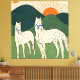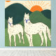 Zwei gepunktete Pferde stehen schön in einem grünen Tal, eingebettet in das warme Licht einer aufgehenden Sonne. Die sanfte Hügellandschaft und der Halbmond verleihen der Szene eine ruhige und traumhafte Atmosphäre. Dieses minimalistische, aber lebendige Kunstwerk spiegelt die Schönheit der Natur und den freien Geist der Pferde wider.