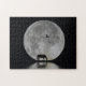 Ein lustiges und surreales Bild eines Pferdes, großer Mond und Rabe mit einer Reflexion im Wasser.